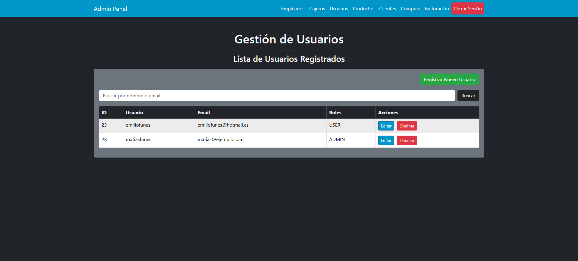 * **Buscar por nombre o email**: Un campo de búsqueda para filtrar la lista de usuarios por nombre de usuario o correo electrónico.