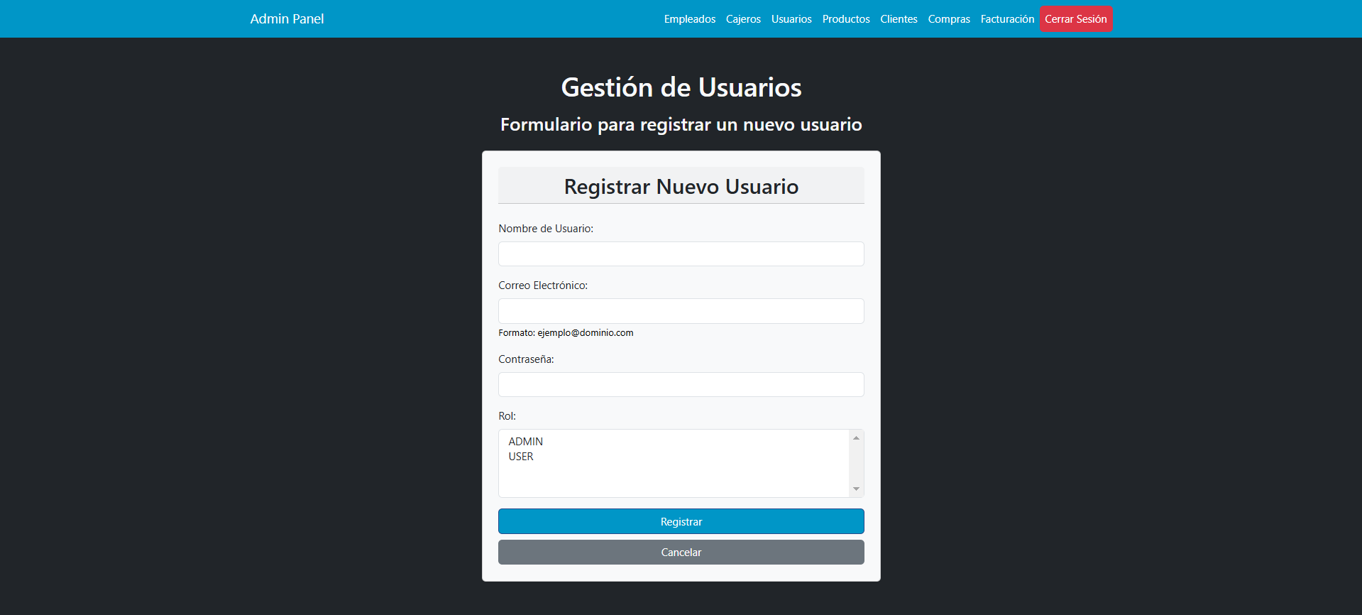 * **Rol**: Desplegable donde se selecciona el rol del usuario (ADMIN, USER), que define el nivel de acceso dentro de la aplicación.
