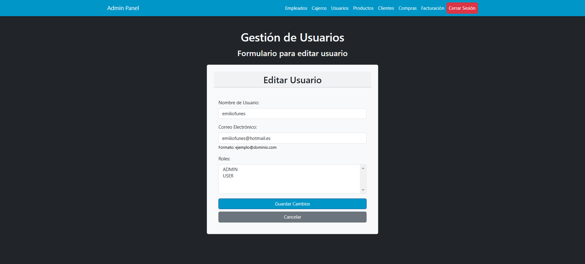 * **Roles**: Desplegable donde se pueden modificar los roles del usuario, asignando nuevos permisos o restricciones dentro del sistema.
