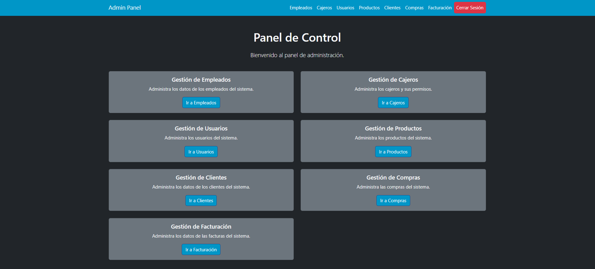 Cada campo del panel está diseñado para proporcionar un acceso directo y sencillo a la funcionalidad correspondiente, asegurando que los administradores puedan gestionar las operaciones de manera eficiente y sin complicaciones.